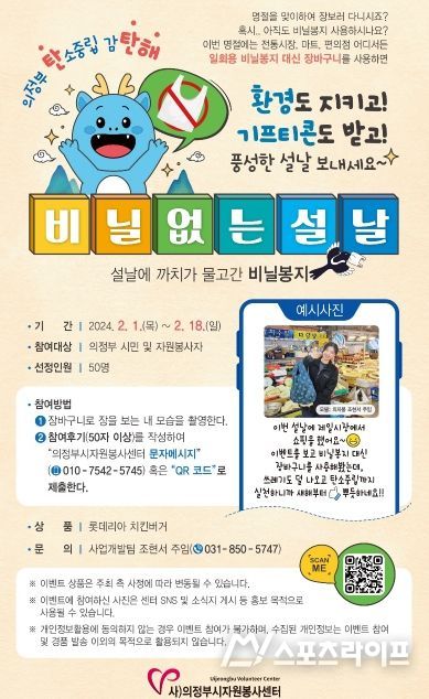 해당 이벤트는 명절 기간 동안 시장을 이용할 때 일회용 비닐봉지 대신 장바구니를 사용하여 일상생활 속에서 탄소중립을 실천할 수 있도록 촉진하기 위해 진행하며, 의정부제일시장(전통시장)을 포함한 마트, 편의점 등 쇼핑을 할 때 장바구니를 사용한 후 인증사진과 활동 후기(50자 이상)를 QR코드 또는 자원봉사센터 휴대폰 메시지(010-7542-5745)로 제출하면 50명을 선정하여 경품을 제공한다.