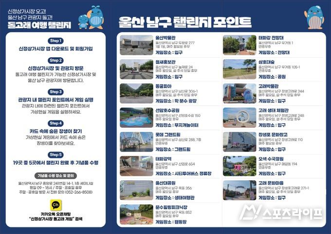 (스포츠라이프) 울산 남구는 신정상가시장 문화관광형시장 육성 사업 중 남구의 대표 관광지와 시장을 연계한 ‘돌고래 여행 챌린지 사업’을 인기리에 추진 중이라고 6일 밝혔다.