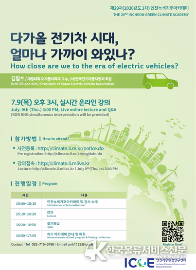 (한국물류서비스신문) 인천연구원 인천기후환경연구센터(센터장 : 조경두)는 오는 7월 9일 오후 3시, “다가올 전기차 시대, 얼마나 가까이 와있나”라는 주제로 <제29차 인천녹색기후아카데미>를 실시간 온라인 강의로 개최한다.