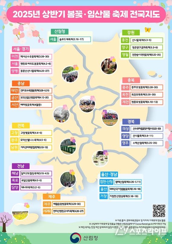 산림청은 전국의 산림과 관련된 축제를 한눈에 볼 수 있는 2025년 상반기 '봄꽃·임산물 축제 전국지도'를 발간했습니다.